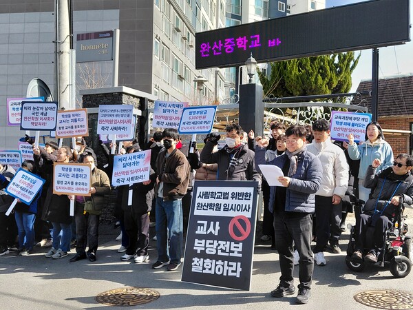 참가자들은 “부당 인사 일삼는 완산학원 임시이사회를 즉각 해임하라”, “횡령 교사를 옹호하는 임시이사회는 사퇴하라” 등의 문구가 적힌 피켓을 들고 규탄 발언을 이어갔다.